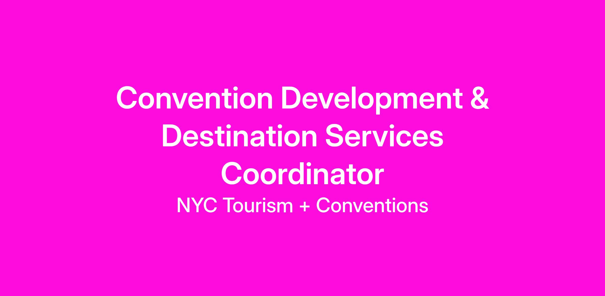 POSITION SUMMARY: This position serves as a primary contact for all internal and external communications between the Convention Development team, Destination Services team, our clients, members and internal New York City Tourism + Conventions Departments. Responsibilities include but are not limited to preparing correspondence, call screening, financial processing, meeting coordination, and project management.