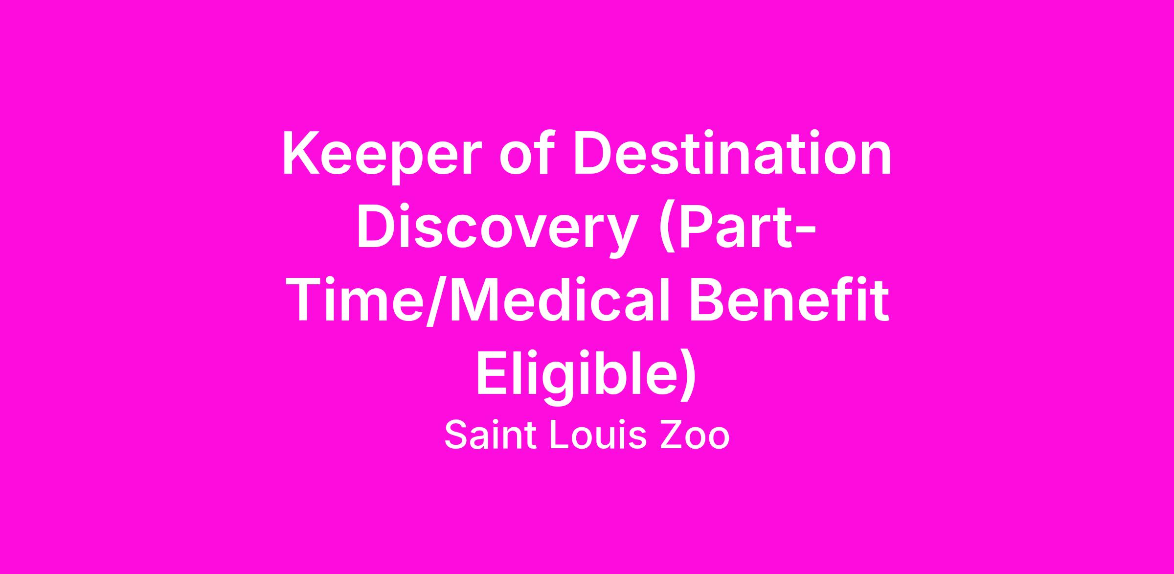Position Summary: The Saint Louis Zoo is looking for an animal care professional to serve as a Henry A. Jubel, Destination Discovery (DD) Part Time Keeper. Destination Discovery staff collaborate with our Conservation Education Department to create inspiring, educational and transformational early childhood and family programming. Learn more about Destination Discovery here: https://stlzoo.org/news/destinationdiscovery