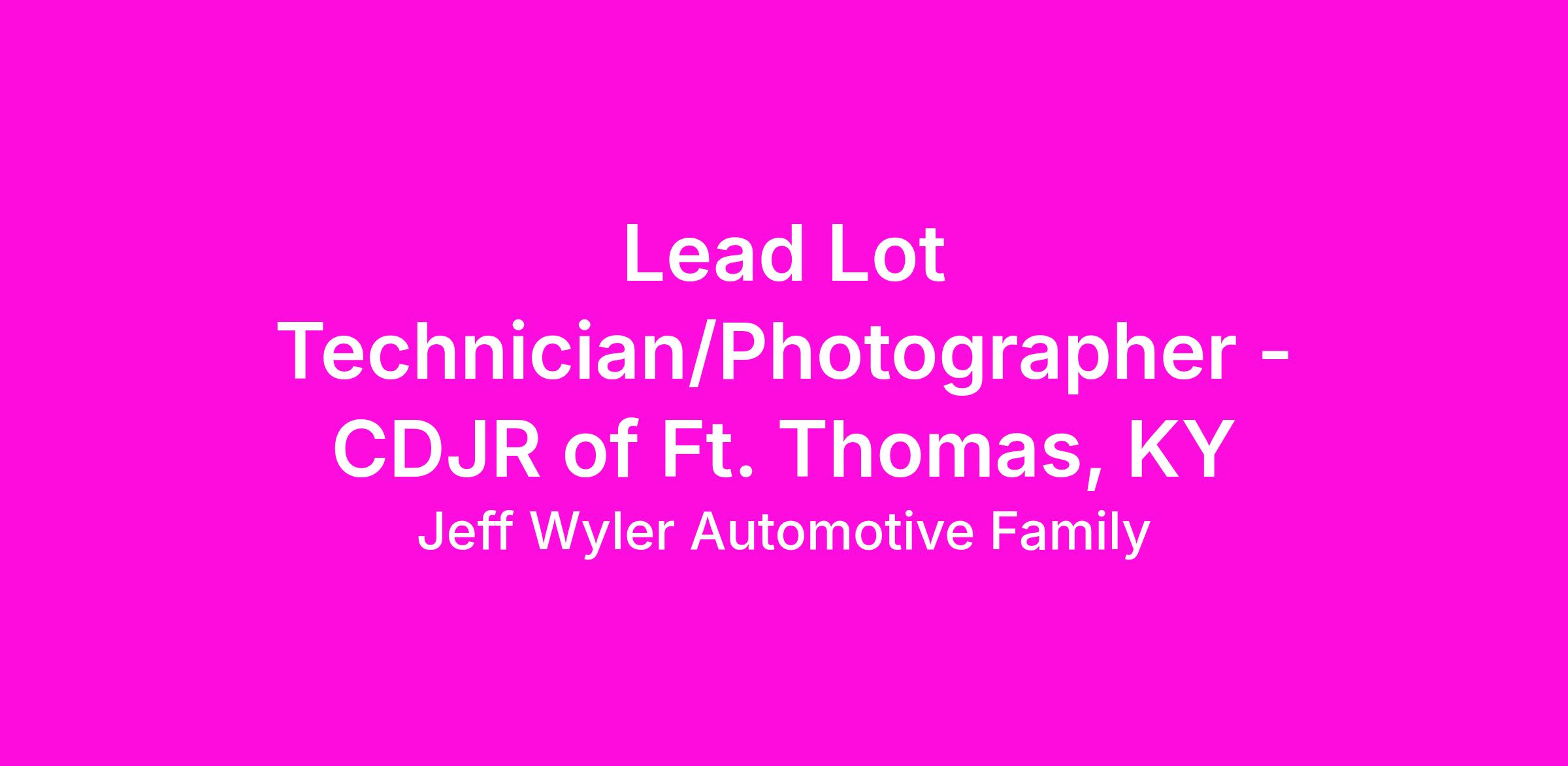 Jeff Wyler CDJR of Ft. Thomas is looking for an experienced Lead Lot Technician/Photographer to assist in keeping the new/used vehicle lot neat and orderly, moving cars as directed by management and in accordance with facility display standards. You will also be responsible for taking photos of vehicles and posting them online including websites & social media pages.