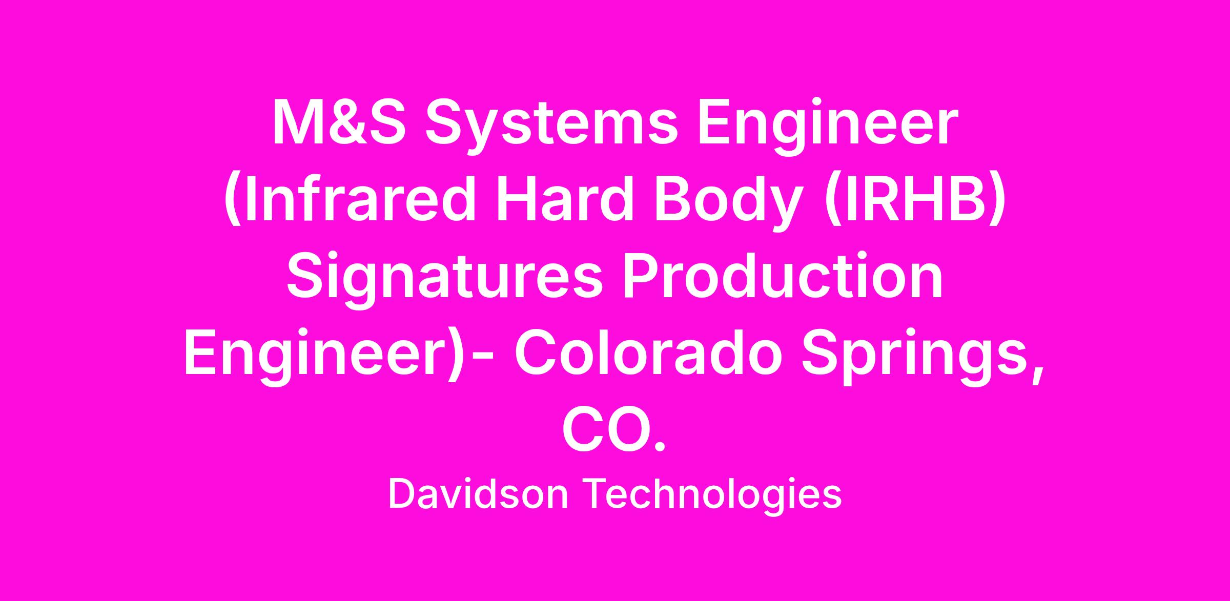 Davidson is seeking a Modeling & Simulation Systems Engineer - Level 2 (Infrared Hard Body (IRHB) Signatures Production Engineer). This exciting career opportunity at the TMC is responsible for the development and delivery of high-fidelity threat modeling products in support of the Missile Defense Agency (MDA) and MDA's Ballistic Missile Defense System (BMDS). TMC is responsible for the development of models and simulations (M&S) used to stimulate element models of MDA's BMDS, including kinematic missile modeling, IR and RF signatures modeling, data production/analysis activities, and maintenance/sustainment activities for the entire TMC software baseline. TMC is a cornerstone element to the Specialized Warfighter Development Contract (SWDC), as part of the MDA Engineering Directorate (DE) Task Order.