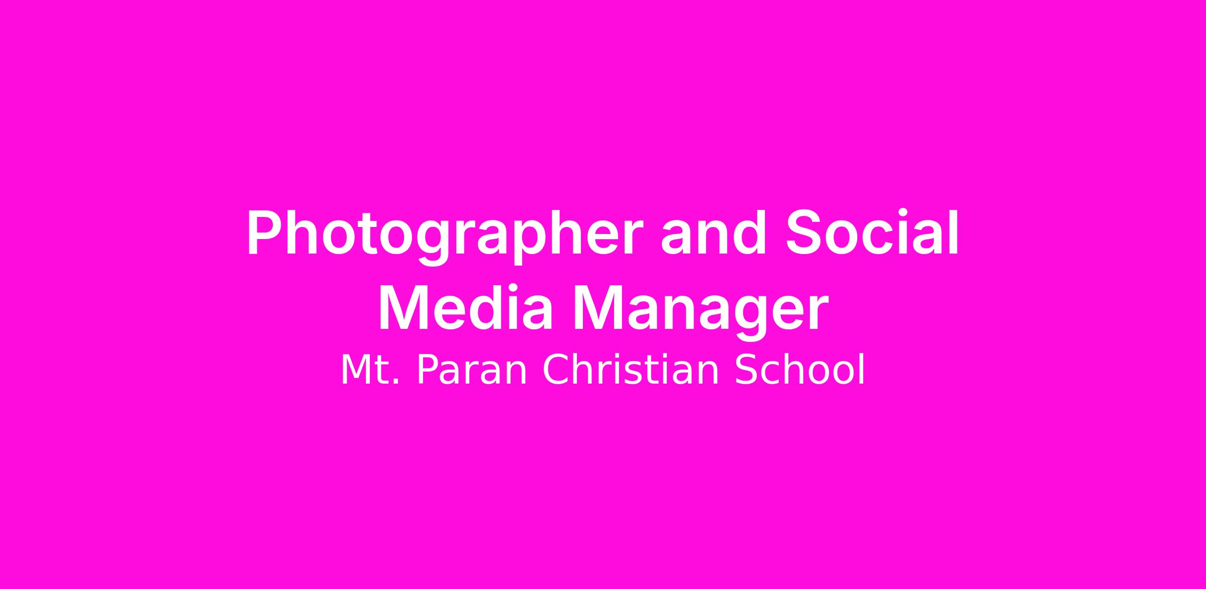 JOB DESCRIPTION: The (photographer and) Social Media Manager is responsible for assisting in the execution of the internal and external marketing and communication plan emulating the vision, mission, core values, and strategic goals of Mount Paran Christian School. The program focuses on competitive positioning of the school through coordinated brand management, increased visibility and awareness, visual communications support, and enhancements in communications content. Responsibilities of Social Media Manager include photography content capturing and editing, writing and storytelling, and scheduling social media on all school platforms, monitoring analytics, and ensuring a quality voice for the public persona of the organization.
