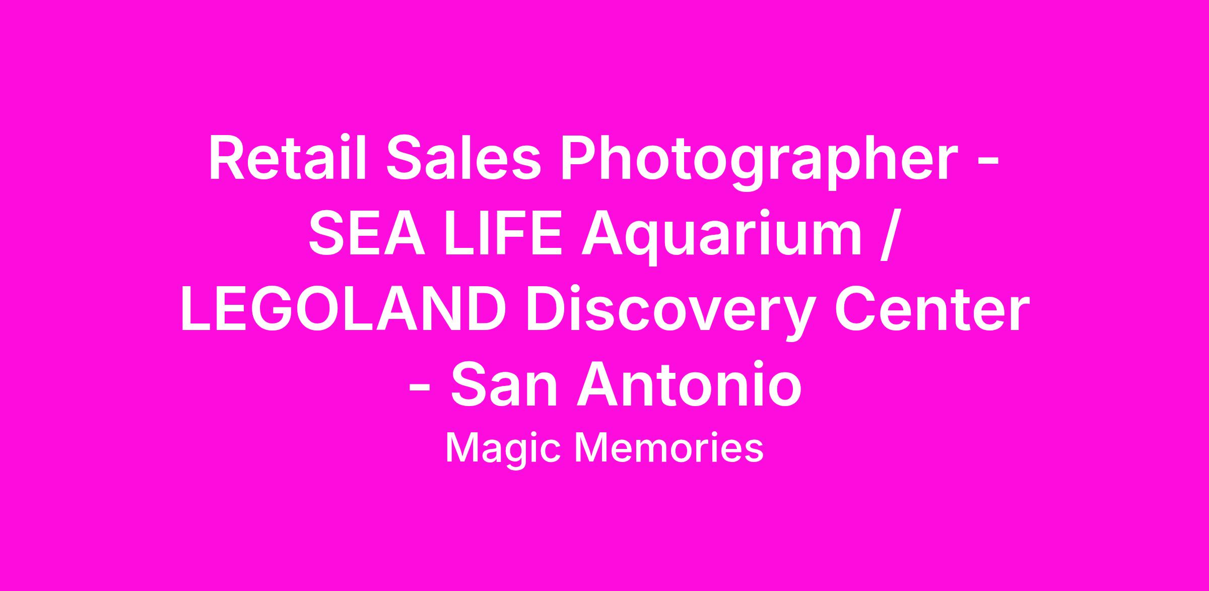 Picture yourself working at Magic Memories in a rewarding, fast-paced environment based in San Antonio, TX. We are actively hiring for a Retail Sales Photographer in an exciting and dynamic atmosphere located at our iconic attraction SEA LIFE Aquarium / LEGOLAND Discovery Center!