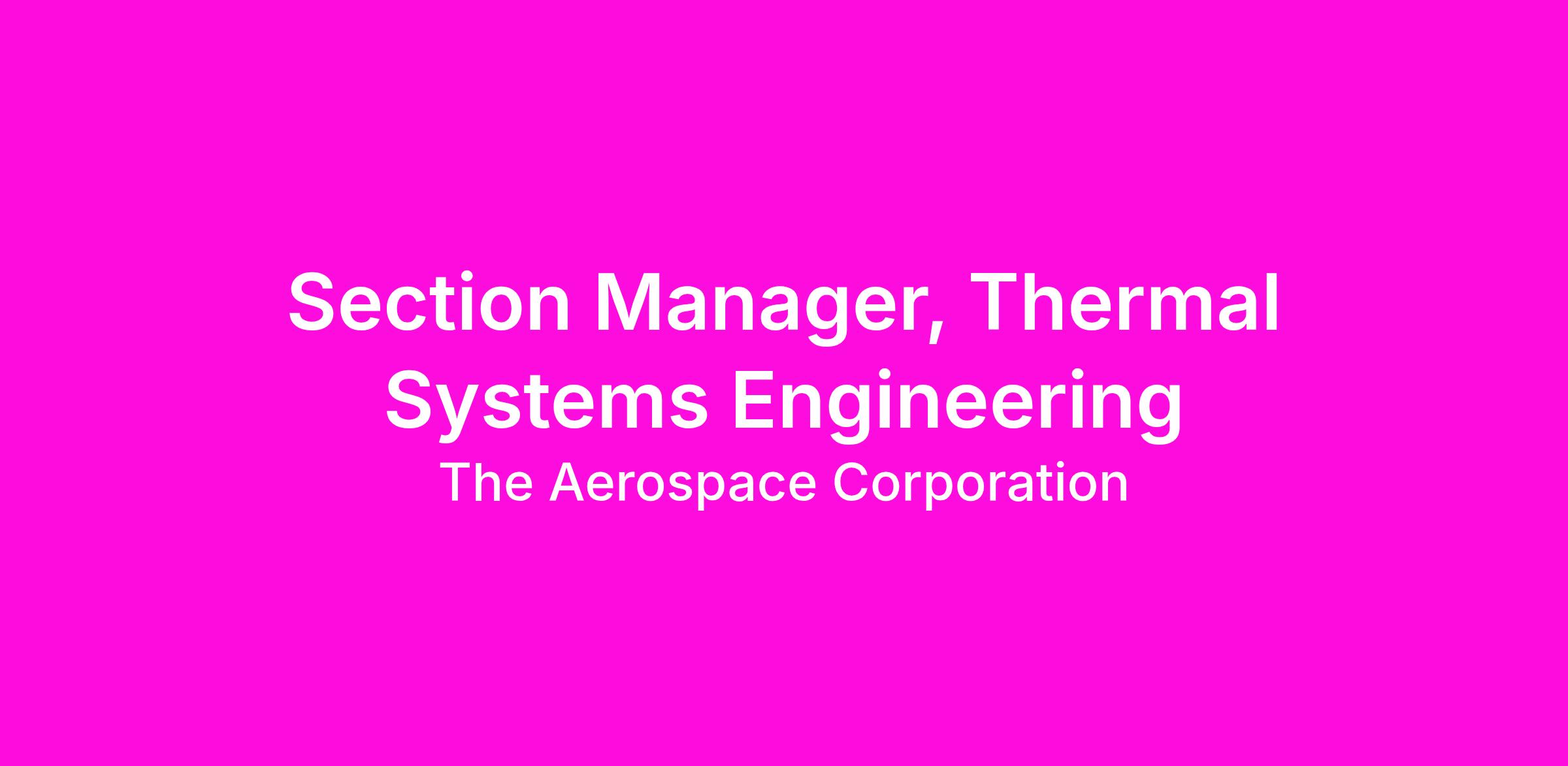 We are seeking a Section Manager, Thermal Systems Engineering (Manager - Aeronautical and Mechanical Engineering) to lead the Thermal Systems Engineering (TSE) Section in the Thermal Control Department (TCD). The mission of the Thermal Control Department is to develop, apply, and communicate thermal engineering expertise for spacecraft, payloads, and related systems to inform and enable key customer decisions.