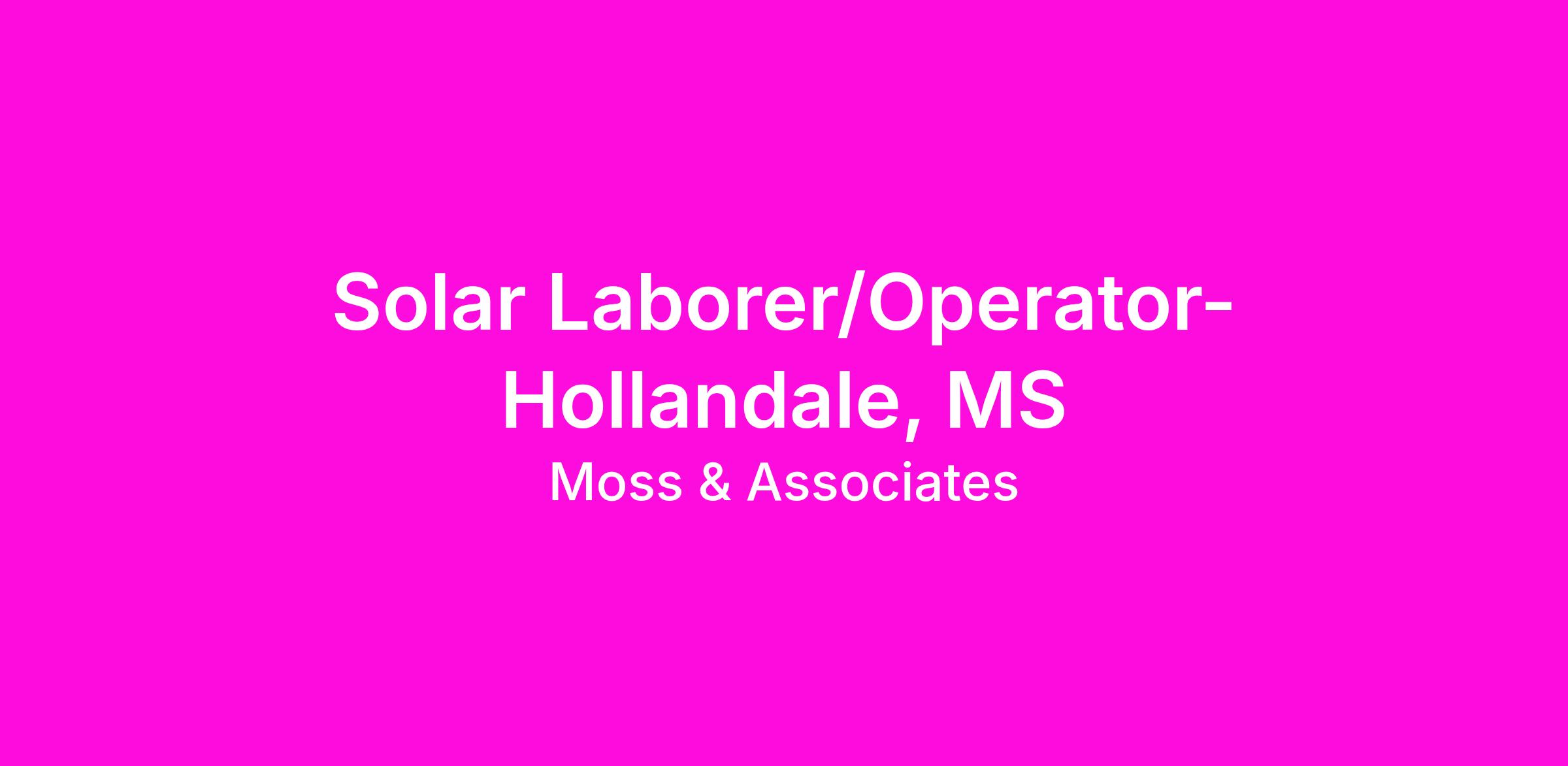 177 Hollingsworth Rd Hollandale, Mississippi 38748If you are hardworking, have a positive attitude, and would like to learn a trade in Solar construction, apply now! MOSS was rated as the #1 Solar Contractor in the country for 2024 and is hiring team members to perform tasks involving construction of utility-scale solar projects on multiple projects. This job requires working outside in all types of weather conditions, while standing and walking for extended periods, and bending, kneeling, and lifting heavy materials. Pay starts at $20 per hour and provides the ability to have growth opportunities with a long-term career and future.