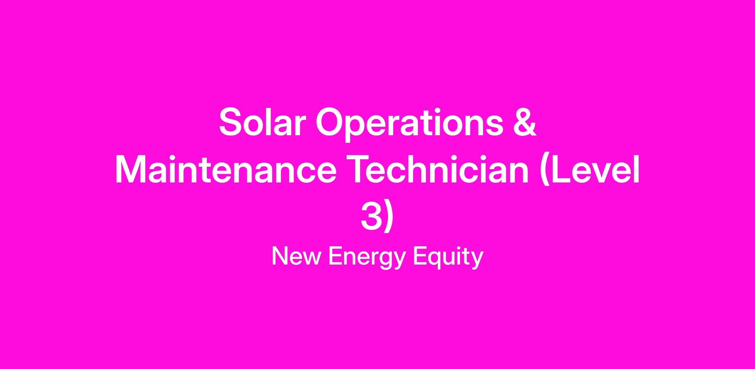 Are you a skilled electrician with a passion for renewable energy? Do you enjoy troubleshooting complex systems and working outdoors? Join Energy Support Services, a subsidiary of New Energy Equity, as an O&M Technician Level 3! In this role, you’ll lead complex inspections, troubleshooting, and repairs on solar energy systems. As a technical expert, you'll provide guidance and training to junior technicians while ensuring our solar projects operate at peak efficiency. If you’re passionate about renewable energy and ready to make an impact, we want to hear from you. Join us and help drive the future of clean energy!