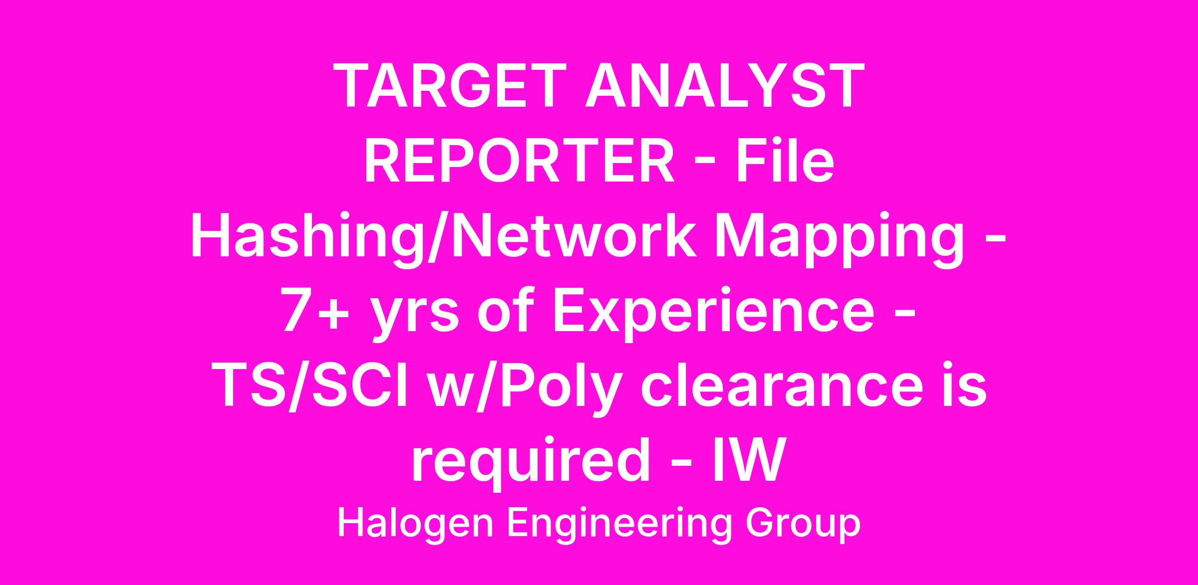 TARGET ANALYST REPORTER - File Hashing/Network Mapping - 7+ yrs of Experience - TS/SCI w/Poly clearance is required - IW